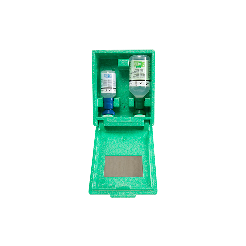 Wall-mounted eyewash stand, pH Neutral 200ml and 500ml Plum Eye Wash.