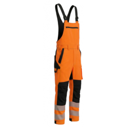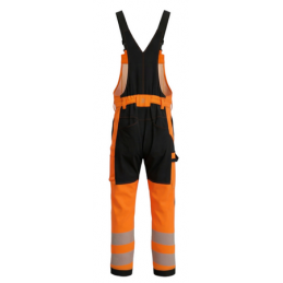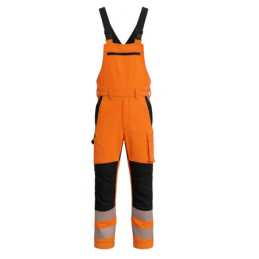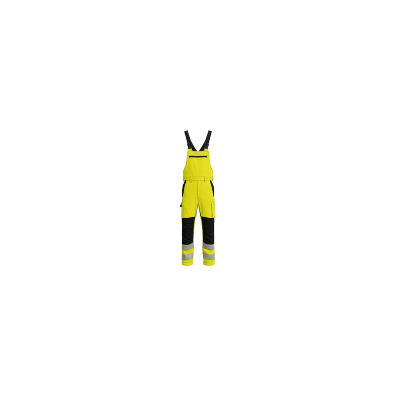 Men's working bib pants in combination with HI-VIS fabric in the bottom of the legs and 2 reflective stripes.