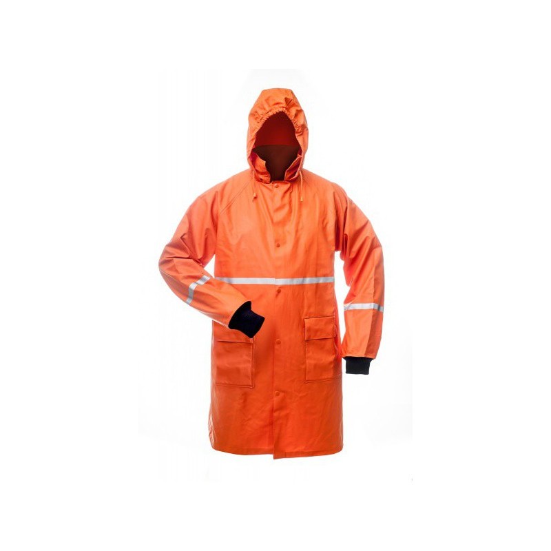 The rain coat is 120 cm long. The coat has 2 side pockets and the coat closure has spy buttons. The hood may be folded around the collar.