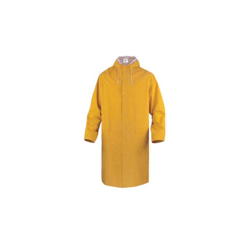 The rain coat is 120 cm long. The coat has 2 side pockets and the coat closure has spy buttons. The hood may be folded around the collar.