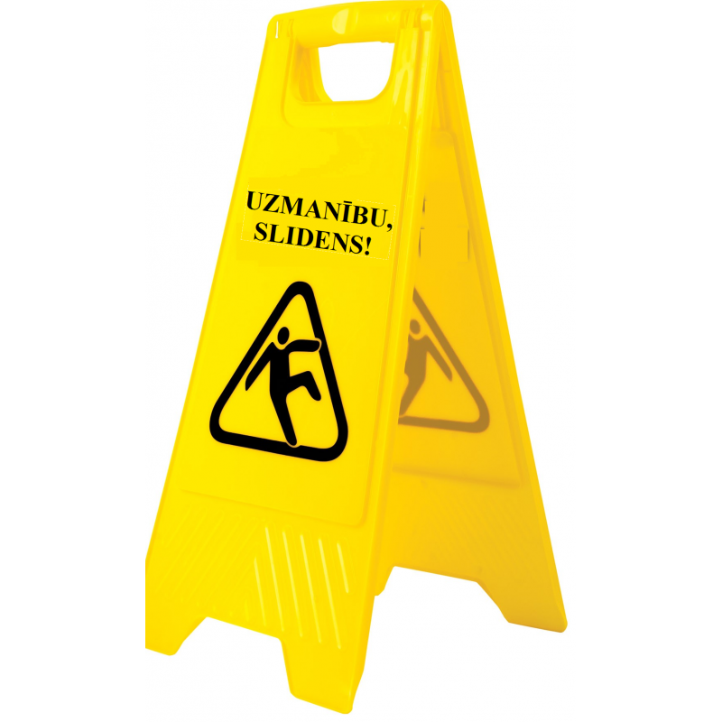 Saliekama brīdinājuma zīme izgatavota no izturīgas plastmasas. Uzraksts abās pusēs latviešu valodā: UZMANĪBU, SLIDENS!