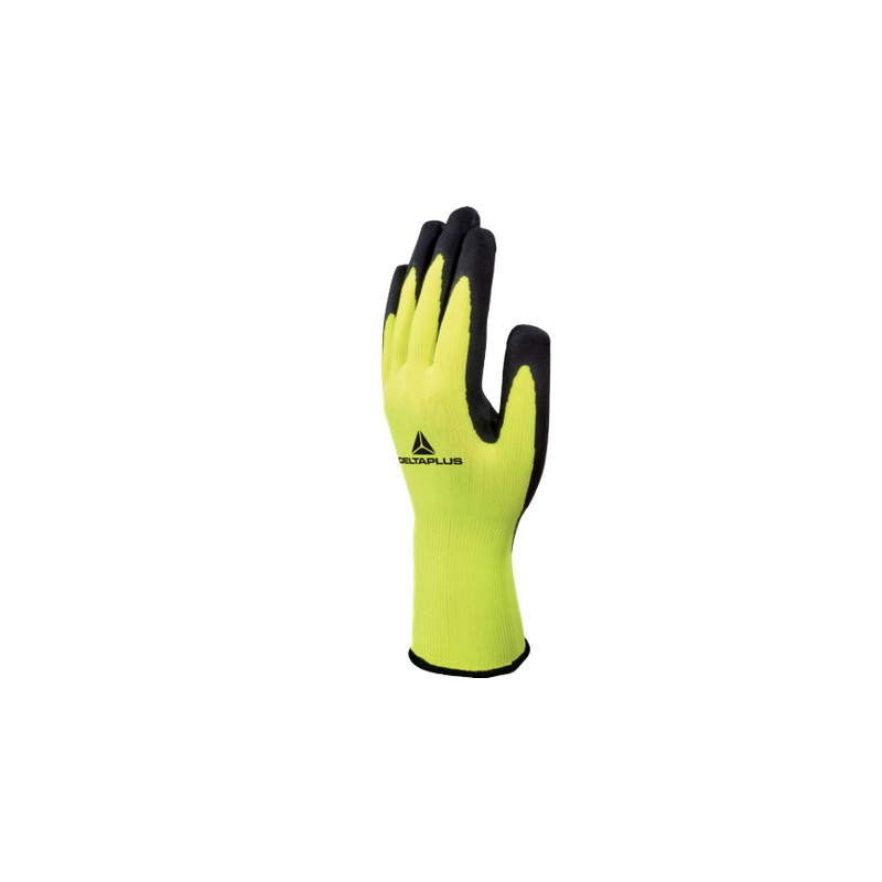 Adīti poliestera cimdi koši dzeltenā krāsā ar melnas krāsas lateksa pārklājumu APOLLON